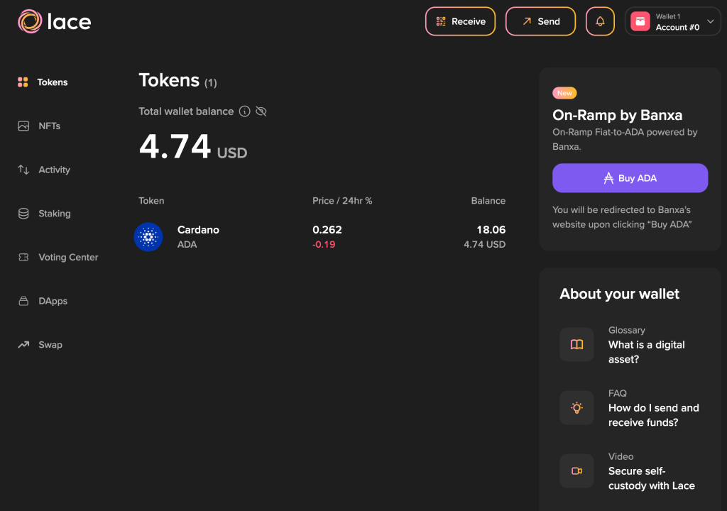 “Lace Wallet dashboard showing ADA balance and navigation tabs”