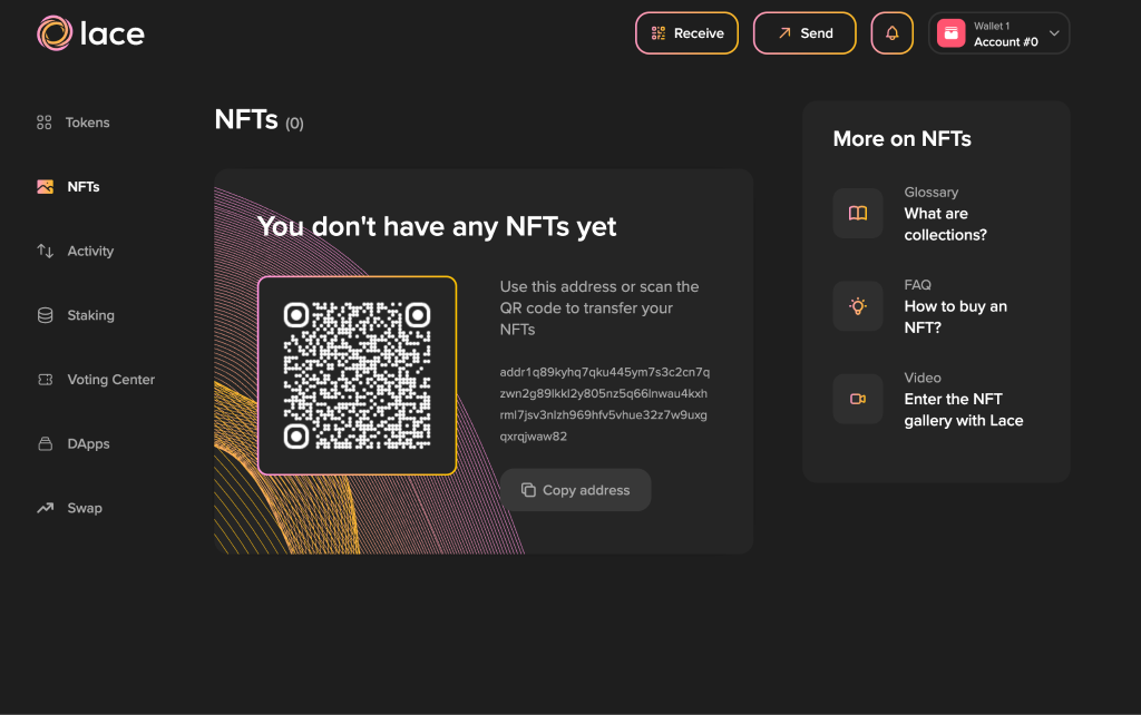 Lace Wallet supports Cardano native NFTs.